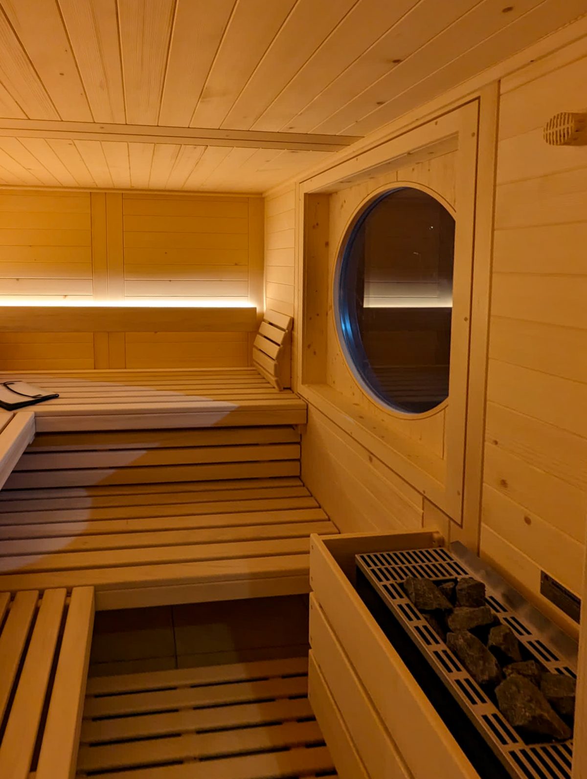 ● Eine Sauna hat keinen eigenen Boden. Der Boden unter der Sauna sollte leicht zu reinigen und feuchtigkeitsbeständig sein (z. B. Fliesen). Wir empfehlen auch in der Saunakabine eine Fußbodenheizung. Der angenehme warme Boden reduziert die Rutschgefahr und verhindert die Schimmelbildung.